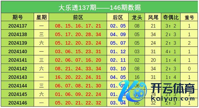 大乐透第2024146期出奖号统计:前区05、20、21、22、322026买球站体育信息,后区03、04。龙头05,凤尾32,奇偶比2:3,开出1枚重号。