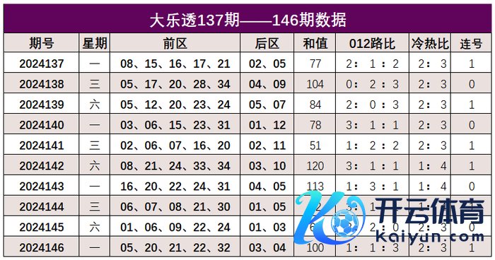 大乐透第2024146期出奖号统计:前区05、20、21、22、32,后区03、04。和值100,012路比1:1:3,冷热比2:32026买球站体育信息,开出1组连号。
