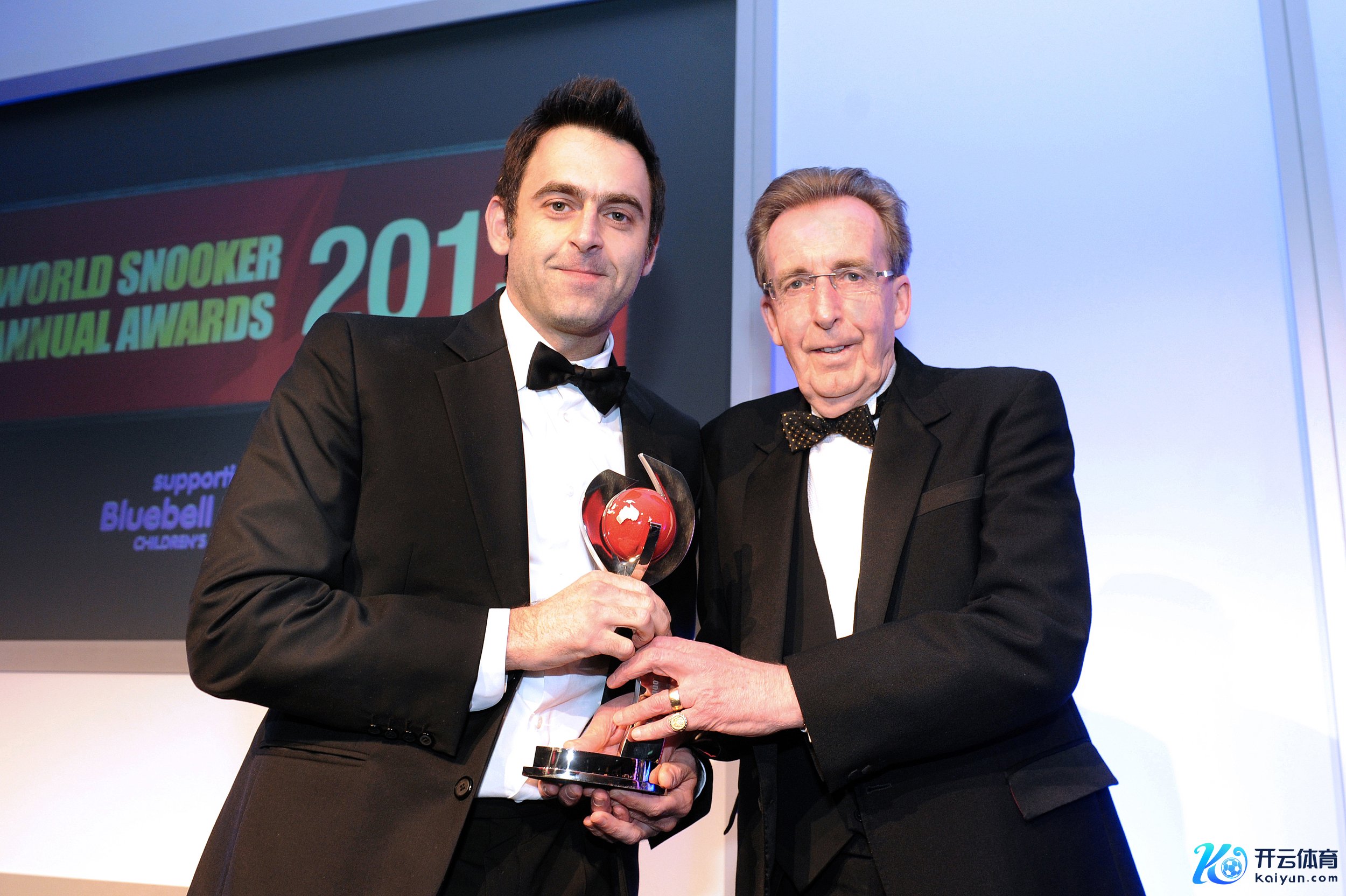 2013世界斯诺克授奖晚宴,奥沙利文获颁最好发达奖,与威尔士名宿格里菲斯合影。