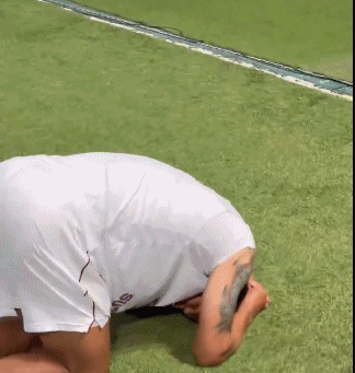 这位前AC米兰、切尔西巨星,从球场一端的底线处运转跪地前行,一直跪行到球场另一端的底线处。100米的跪行之后,蒂亚戈-席尔瓦跪地折腰,向看台上稀稀落落的球迷问候。
