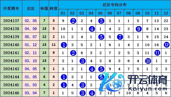 上期后区开出号码03 04,和值7,近十期和值 7 13 12 13 13 13 9 6 4 7,和值波动领域较大,本期预测和值会下跌,要点柔软号码:02 04,和值6。