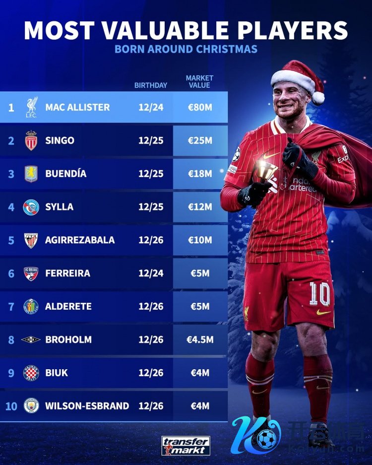 12月25日讯 今天是圣诞节,德国转会市集统计了圣诞节前后树立的球员的身价名次,麦卡利斯特8000万欧元遥遥卓绝。